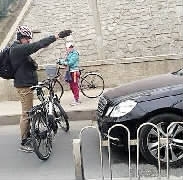 11月17日《南方都市报》报道,北京一名老外阻止小轿车违规上自行车道的照片,这两天在微博火了。据@央视新闻等多家媒体援引网友发布的图片称,当时这名老外直接把自行车横在违章的小轿车前,非常执着。对此,网友疯狂点赞。公安部治安管理局官微@公安部打四黑除四害则发问:“面对不文明现象,你会像他这样勇敢站出来吗?”