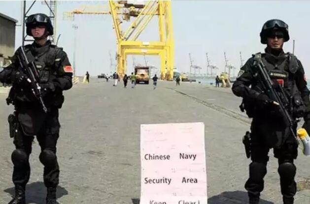 △2015年,在也门亚丁港,海军特战队员进行警戒,标牌上写有“Chinese Navy Security Area. Keep Clear!”字样英文,翻译成汉语大意是“这里是中国海军领域,闲人勿近!”