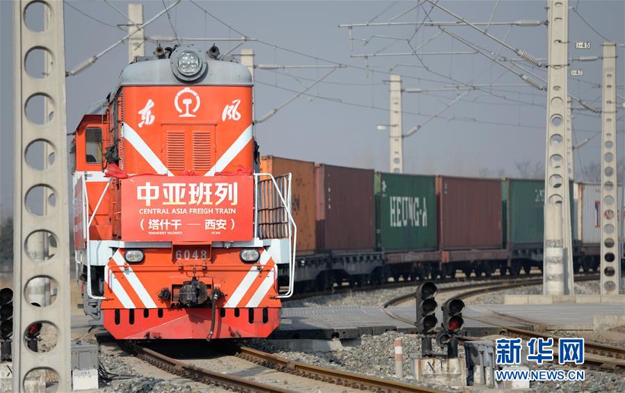 运载着1000吨棉纱的“塔什干-西安”中亚班列抵达西安新筑车站(2017年2月24日摄)。新华社记者 李一博 摄