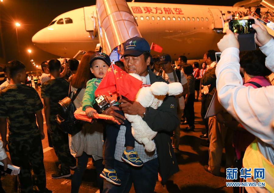 10月1日晚,在上海虹桥机场,飓风受困同胞走下飞机前往摆渡车。两架东航包机飞越19国,接回此前在加勒比岛国多米尼克遭遇飓风受困的同胞。新华社记者 丁汀 摄