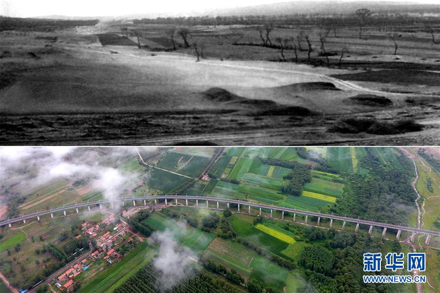 拼版照片:上图为治理前的山西省右玉县右卫镇的景象(资料照片);下图为现在山西省右玉县右卫镇一带的景象(2017年7月22日 新华社记者 詹彦 摄)。新华社发