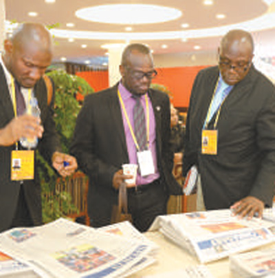 外国记者在十九大新闻中心翻阅报纸,了解十九大新闻。