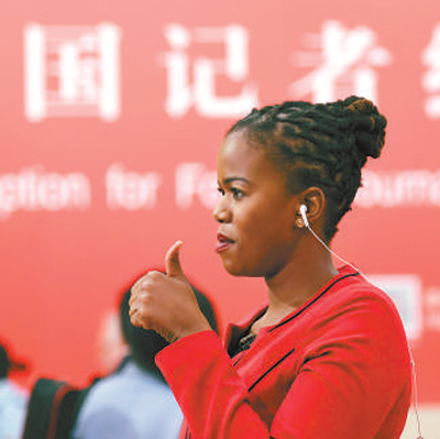外国记者在十九大新闻中心进行现场连线报道。