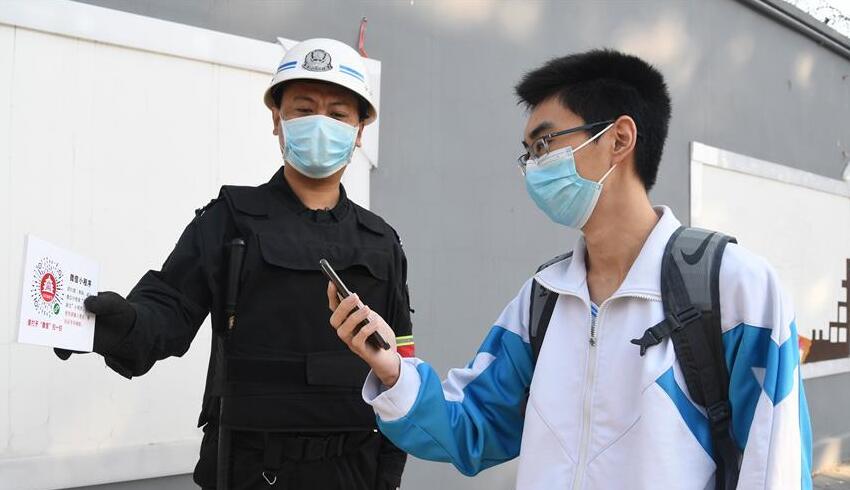 图为,4月27日,在位于北京市海淀区的中国农业大学附属中学,一名高三年级学生在进入校园前扫描“健康码”。 当日,北京市高三年级学生开学复课。图片来源:新华网