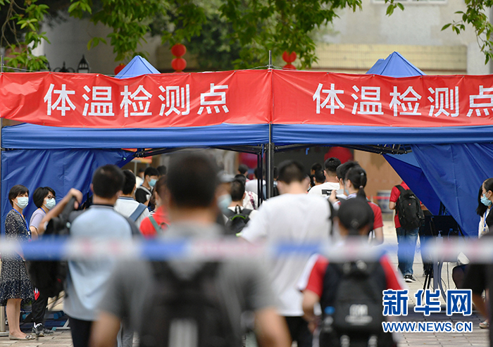 7月7日,在福州第二中学考点,考生进入考场前有序通过体温检测点。当日,2020年高考拉开帷幕。 新华社记者 魏培全 摄