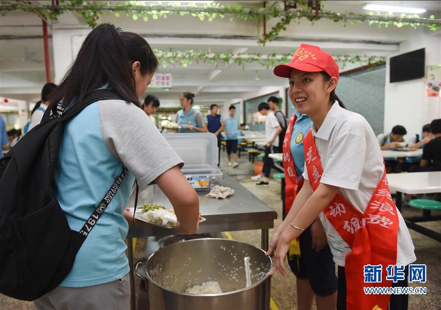6月9日,在福建省云霄县元光中学食堂,“光盘行动组”成员在提醒学生按需取食。新华社记者 宋为伟 摄