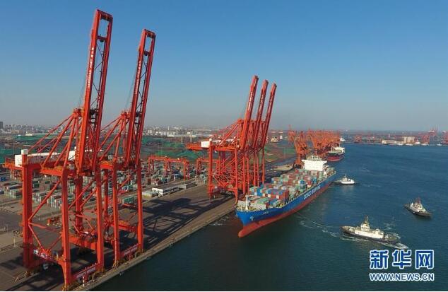 3月13日,货轮在向唐山港京唐港区集装箱码头靠泊(无人机照片)。新华社发(记者杨世尧 摄)