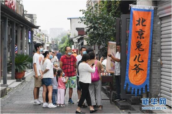 在北京杨梅竹斜街,游客在一家经营传统老北京手工艺品“兔儿爷”的小店参观(8月17日摄)。新华社记者 鞠焕宗 摄