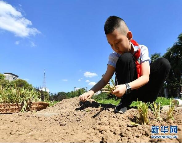 8月31日,学生在西安市小雁塔小学农耕劳动实践基地进行蔬菜移栽。新华社记者 张博文 摄