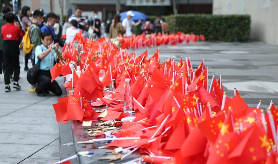 上海四行仓库抗战纪念地晋元纪念广场,无数各地游客前来缅怀“八百壮士”。弹孔墙前,游客们竖起一面面国旗,寄托了人们对先烈的崇敬。图片来源:东方IC