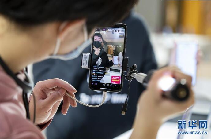 在河南省郑州市一家商场,售货员利用网络直播平台推销手机商品。 新华社发(王威 摄)