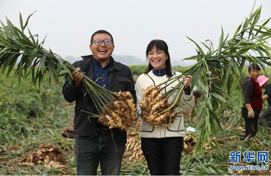 张良镇返乡创业者杜飞飞夫妇通过“公司+合作社+农户”的产业发展模式,打造了属于自己的一片“姜山”,成了张良镇重要的带贫支柱产业。新华网发 杨天增 图