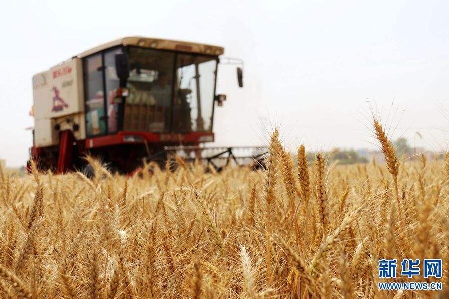 5月19日,在河南南阳市内乡县赵店乡张庄村,大型收割机在收割小麦。新华网发 张中立 摄