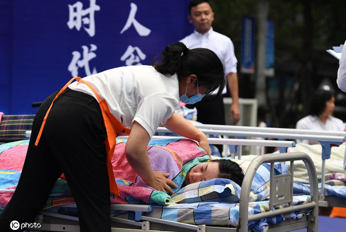2020年9月24日,重庆市南岸区举行2020年家庭服务业“服务好帮手”技能大赛暨家政服务宣传日活动。来自辖区的24名家政服务人员,围绕婴幼儿护理、老年人护理、居家保洁和厨艺比拼四个项目同台竞技。图为参赛选手正在进行老年人护理技能比拼。图片来源:东方IC