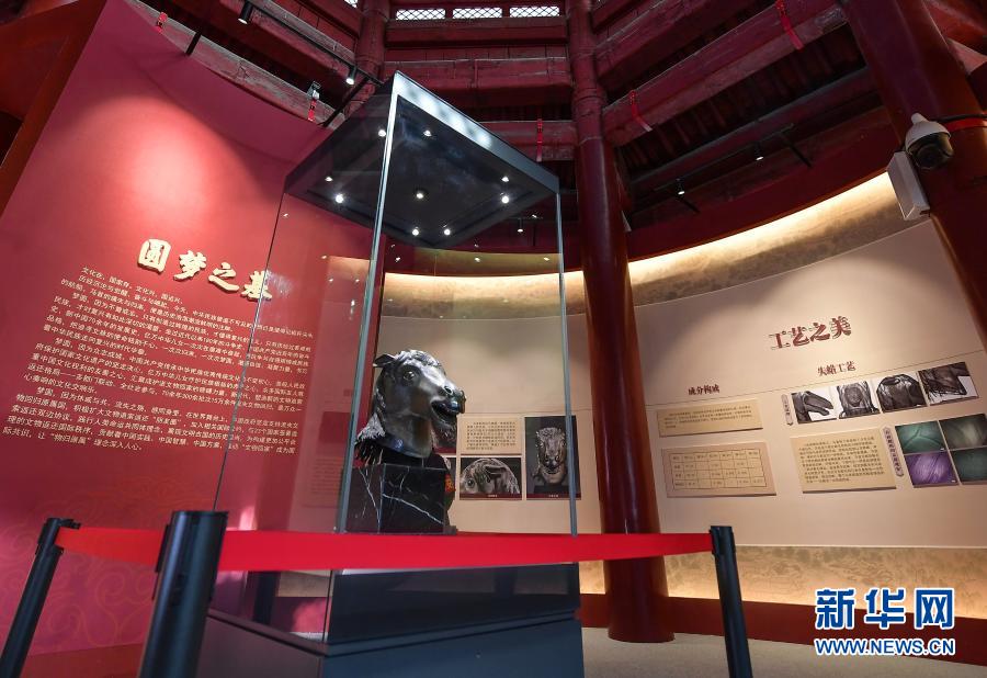 12月1日,马首铜像在圆明园正觉寺文殊亭陈列展出。新华社记者 李贺 摄