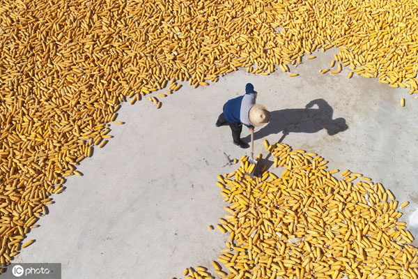 河北省唐山市丰润区小张各庄镇大张各庄村农民在晾晒收获的玉米(无人机照片)。图片来源:ICphoto