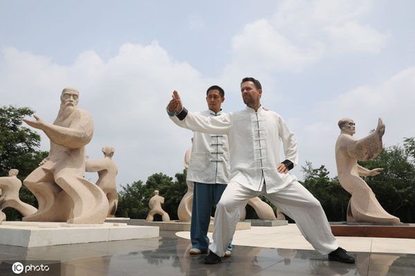 在河南省温县陈家沟太极拳学校,“洋弟子”陈少龙(前)在师父陈自强指导下习练太极拳。图片来源:ICphoto