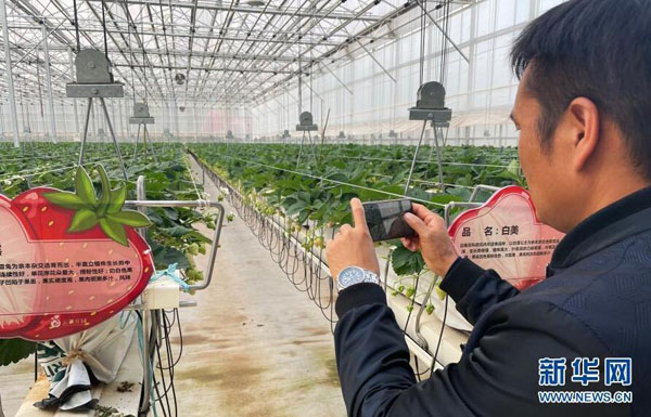 云南省农科院花卉研究所研究员阮继伟在草莓基地拍摄草莓(12月6日摄)。新华社记者 杨静 摄