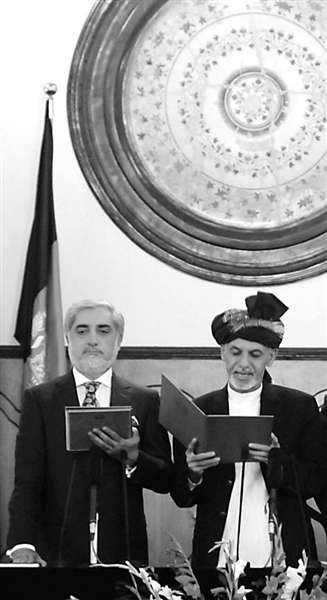 9月29日,在阿富汗首都喀布尔,阿什拉夫·加尼(右)和阿卜杜拉·阿卜杜拉(左)出席宣誓就职仪式。