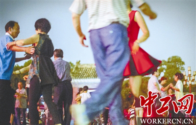 9月10日,北京地坛公园南门的广场前,人们正欢快地跳着交谊舞。(本报记者 吴凡摄)