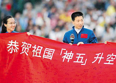 2003年,香港各界欢迎杨利伟及航天团访港,香港学生向杨利伟赠送由师生签名的横幅。新华社发