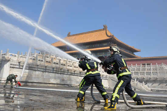 故宫特勤中队的消防官兵在太和殿前演习。故宫特勤中队供图
