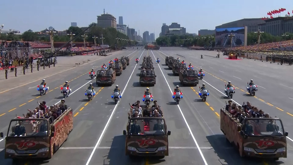 武警国宾护卫队员护卫抗战老战士车队率先通过天安门。李光印摄