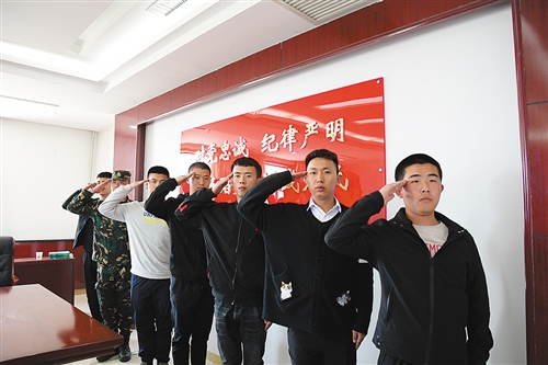 7名主动归队参战退伍老兵敬礼。从右往左依次是宋晓凯、黄奥东、焦红勇、张文辉、白江、王环宇、李晓鹏。(资料图片)