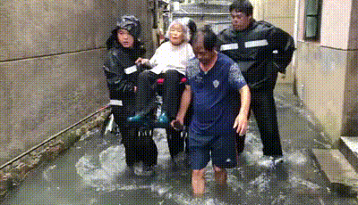 浙江宁波鄞州区的一栋楼里,独自一人在家的老人年事已高、行动不便,因积水过深被困家中。