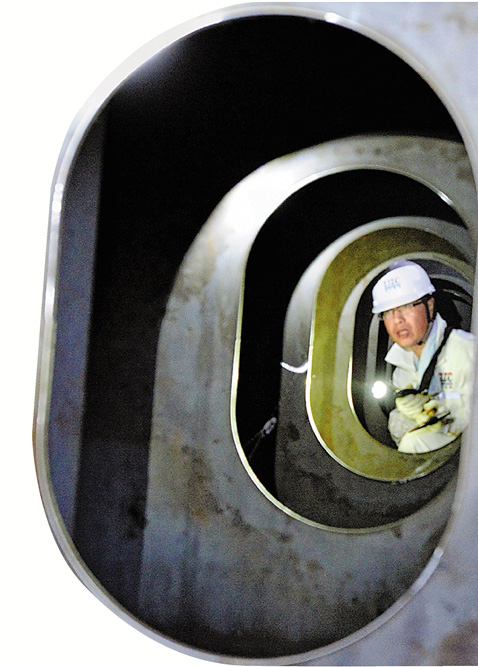 近一米八个头的符汉青身材壮实,在这80厘米高的空间内无法直立,只能匍匐往前爬。他爬爬停停,用猫着腰、仰着头的姿势,细细检查一条一条焊缝,并精确测量钢板尺寸,不时用铁锤敲打。敲到某一处,跟在身后两米远处的谷岳忠突然停下不动了,趴着细听,喊道:“声音不对,有问题,再敲深一点!”果然,再往里敲,烂穿的孔洞藏不住了。