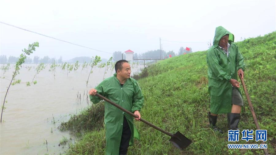 7月26日,安徽省阜南县王家坝镇李郢村党支部书记张斌(左)在堤坝上巡堤查险。 新华社发