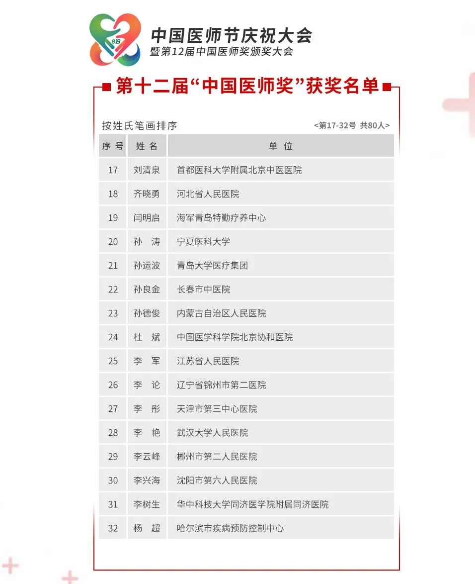 据中国医师协会网站19日消息,第十二届“中国医师奖”获奖名单公布,全国共80位医师入选,其中包括武汉金银潭医院院长张定宇、复旦大学附属华山医院感染科主任张文宏、北京朝阳医院眼科医生陶勇等。
