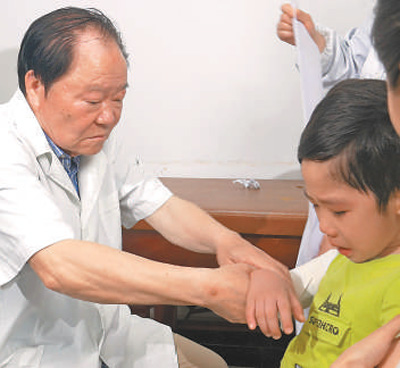 助手握住小男孩骨折的左臂上部,张玉柱(见上图,董飞华摄)左手握住骨折处,右手握住患肢腕部,拔伸牵引,然后将前臂旋后屈肘至100度,纠正移位……复位完毕后,张玉柱扶住手臂,助手将祖传伤膏敷在骨折处,再用裁好的杉树皮夹板、棉花衬垫等固定好手臂。“晚上睡觉要挂牢,不能掉下来……”在浙江富阳中医骨伤医院,张玉柱叮嘱受伤的小男孩。慈眉善目、轻声细语,这是年逾七旬的张玉柱留给人的第一印象。