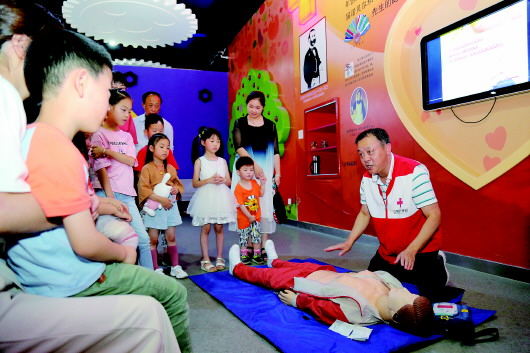 闵华在湖州市科技馆为青少年及家属讲解演示心肺复苏和AED操作。受访者供图