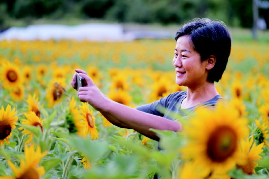 冷菊贞在村里记录向阳葵生长情况(8月17日摄)。新华社记者王建威摄