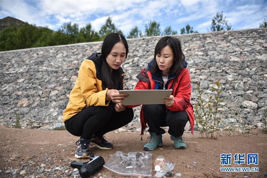 8月13日,长江科学院科考队员闫霞(右)与周华敏在澜沧江上游扎曲旁记录取样数据。 新华社记者 吴刚 摄