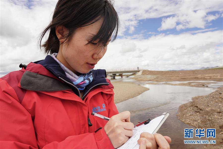 8月14日,长江科学院科考队员闫霞在玉树藏族自治州境内的布曲旁记录取样数据。 新华社记者 吴刚 摄