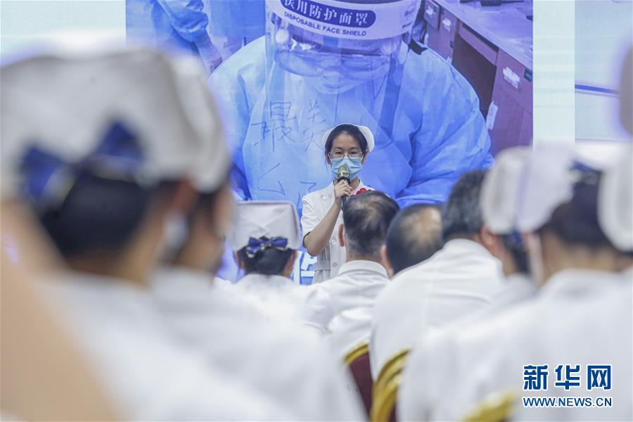 5月11日,北京大学人民医院举办庆祝护士节暨优秀集体和个人表彰活动。这是援鄂医疗队队员代表邰晶在活动上分享战“疫”故事。新华社记者 张玉薇 摄