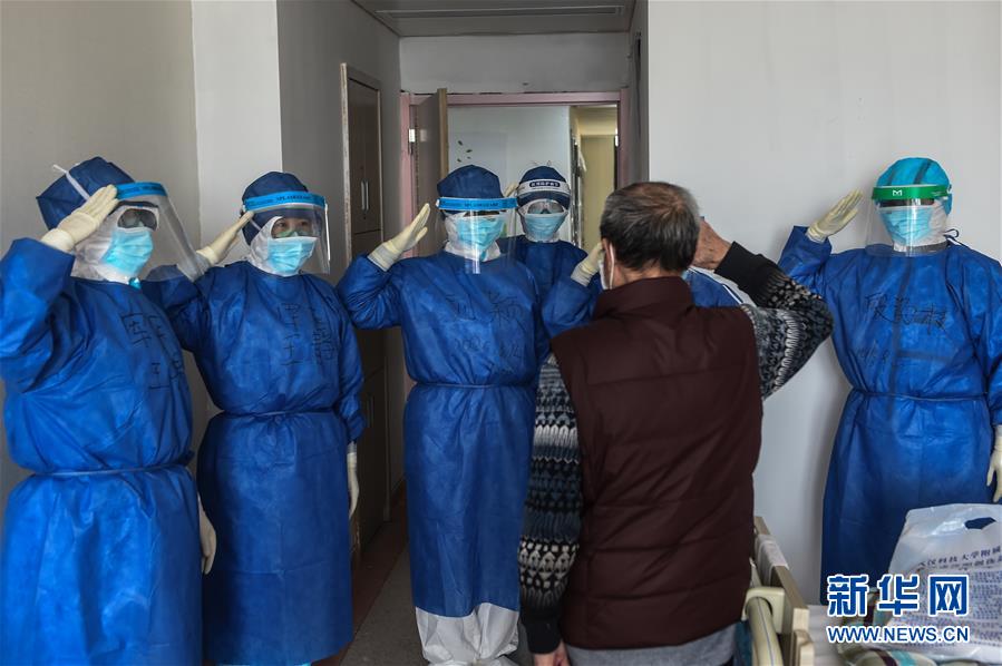 在湖北省妇幼保健院光谷院区,一名即将出院的老年患者向医护人员致敬(3月14日摄)。 新华社发(赵佳庆 摄)
