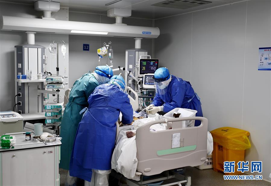 武汉火神山医院重症一科医护人员为患者做气管插管手术(2月24日摄)。 新华社发(王皓宇 摄)