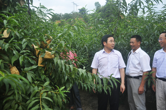 2011年7月,黄诗燕(右三)在霞阳镇考察黄桃种植业。新华社发