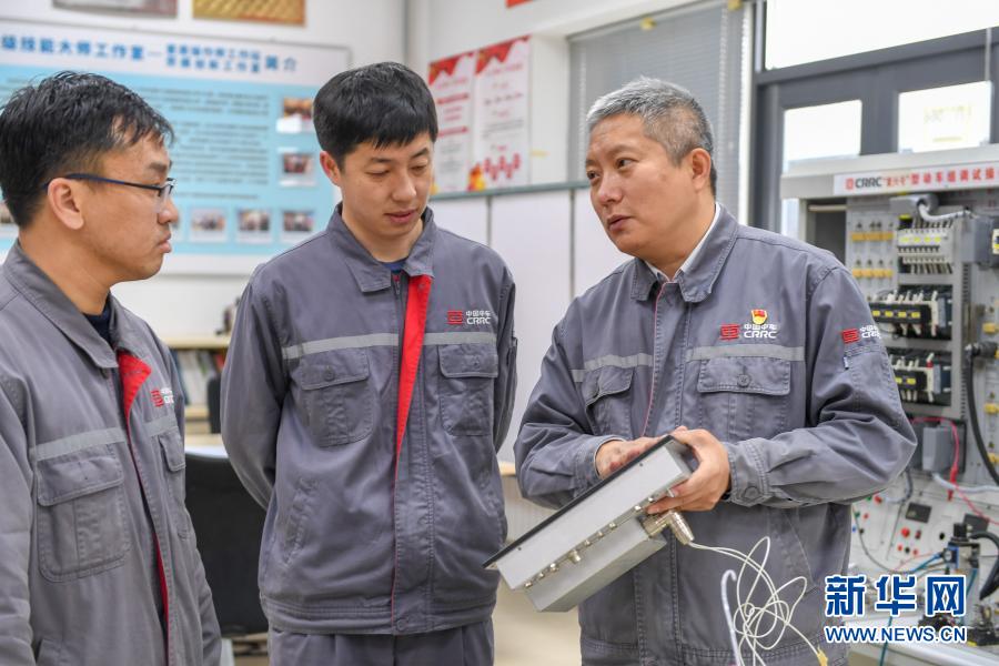 11月25日,在中车长春轨道客车股份有限公司高速动车组制造中心调试车间,罗昭强(右一)与同事研究高铁列车网络实验装置。新华社记者 张楠 摄