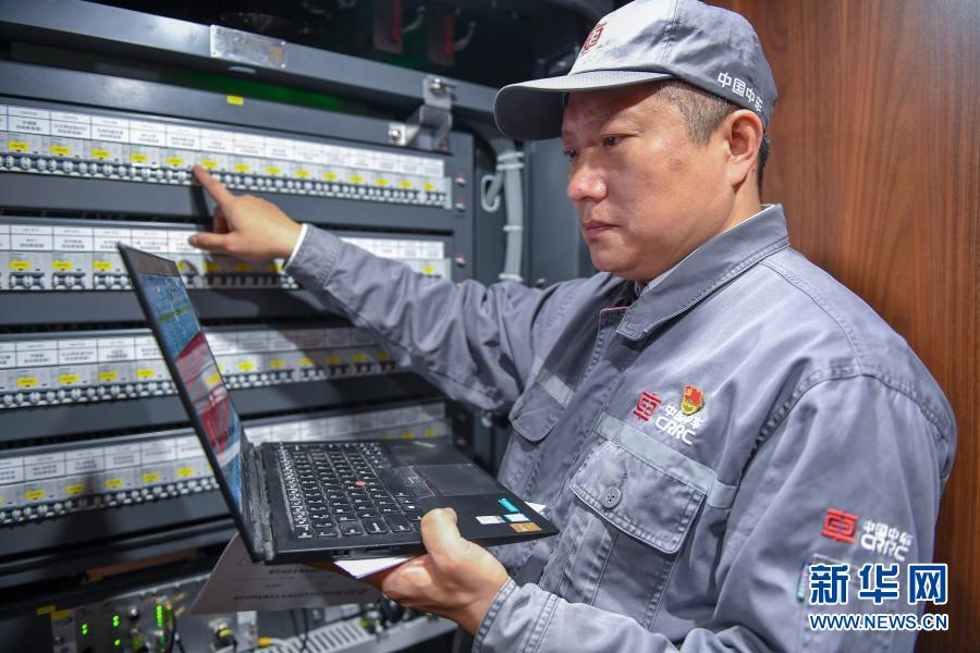 11月25日,在中车长春轨道客车股份有限公司高速动车组制造中心调试车间,罗昭强(右一)与同事检查复兴号高铁列车的电气系统。新华社记者 张楠 摄