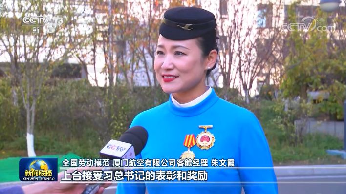 全国劳动模范 厦门航空有限公司客舱经理 朱文霞:作为劳动者的代表,上台接受习总书记的表彰和奖励,自己觉得备受鼓舞。作为一名民航基层的工作者,我会珍惜荣誉,保持本色,做好真情服务的摆渡者、客舱安全的守护者。