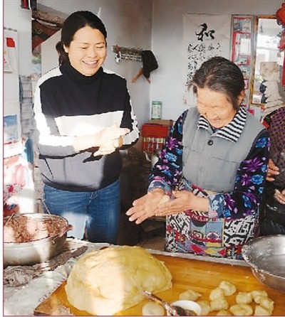 王会敏(左)到村民家包馅糕。赵占南摄