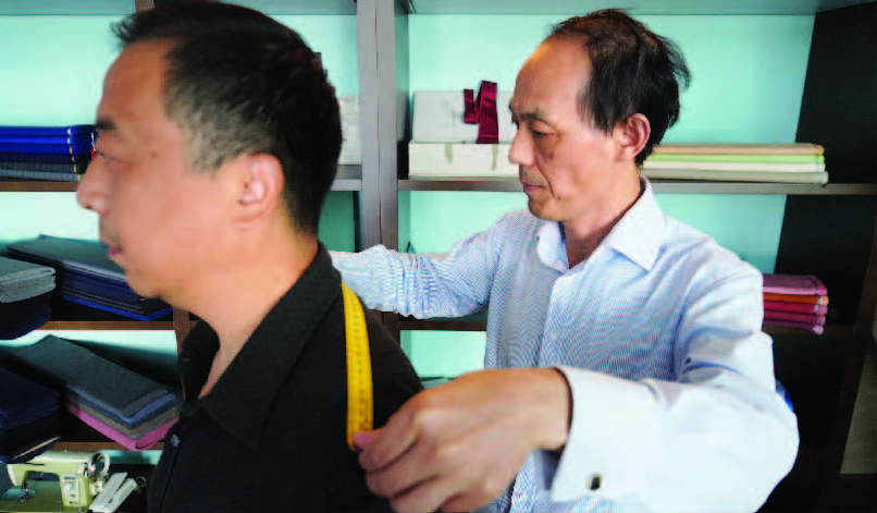 皮尺挂在颈间,一手捏着划片,而另一手持着剪刀,对铺在桌上的面料进行剪裁……对于很多上年纪的上海人来说,为自己找个裁缝师傅,制作一套贴身西装,是一件“扎台型”的事。
