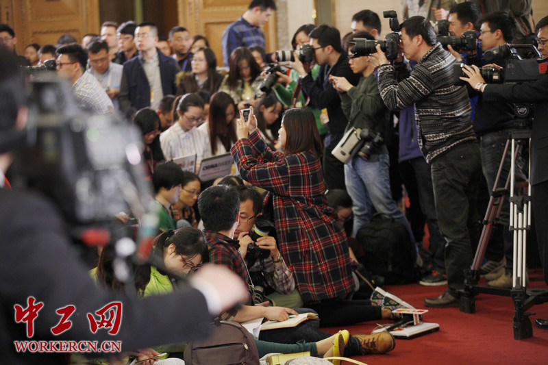 全国政协十二届三次会议新闻发布会召开,今年有超过3100名中外记者采访报道全国“两会”。对记者来说每年一次的全国“两会”是一场“新闻战”。 (中工网记者 韩靖摄)