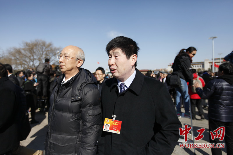 全国政协十二届三次会议3日15时在北京人民大会堂开幕,工会界别委员闫克庆(左一)和李海滨步入会场。 (中工网记者 韩靖摄)