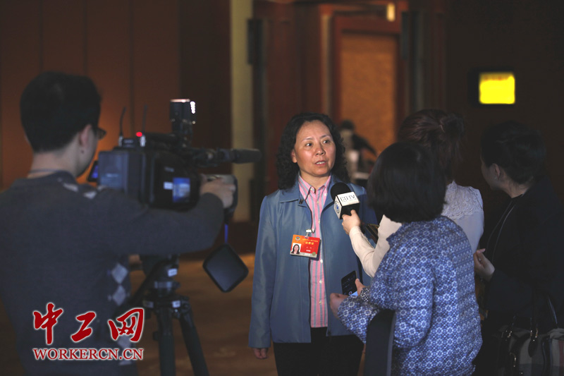 全国政协十二届三次会议于3月4日上午9点举行分组讨论,采访全国“两会”的记者开启“蹲守”模式。图为全国政协委员张玲接受记者采访。 (中工网记者 韩靖摄)