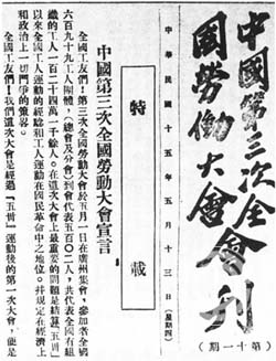 1926年5月1日~12日在广州召开。到会代表502人,代表全国699个总会和分会的124万多会员。中共中央向大会致祝词。邓中夏致开幕词,李立三致闭幕词。大会通过了《关于中国职工运动的发展及其在国民革命运动中之地位报告的决议》、《中国职工运动总策略决议案》、《劳动法大纲决议案》等30多个文件。大会选出了全总第三届执委35名、候补执委17名,选举苏兆征为全国总工会委员长、刘少奇为秘书长。(资料来源:《中国工运》)